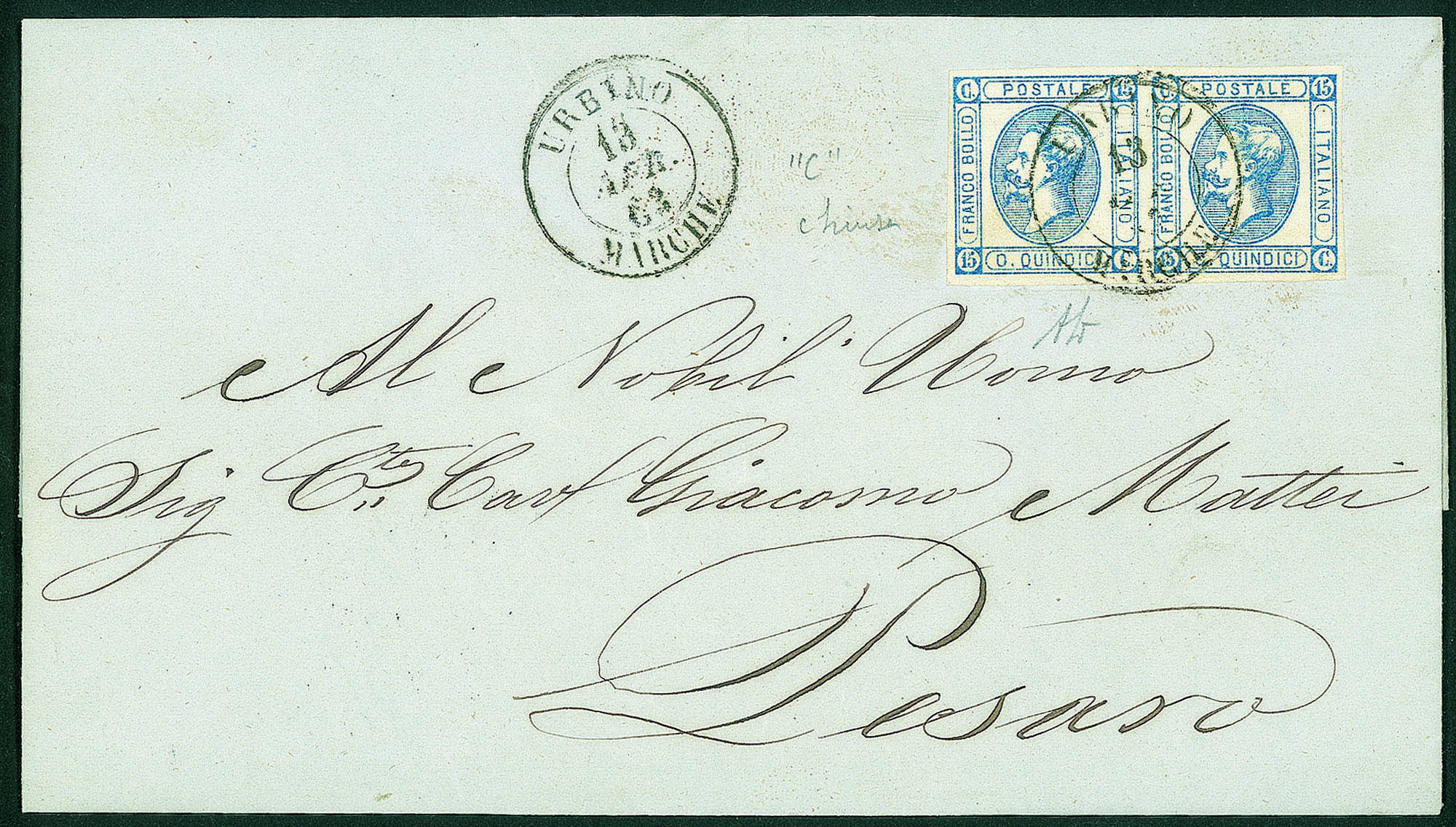 Regno - Vittorio Emanuele II - Coppia del 15 cent litografico (12ca + 12)Con un esemplare C chiusa come O - lettera da Urbino a Pesaro del 13.4.63 - A. Diena