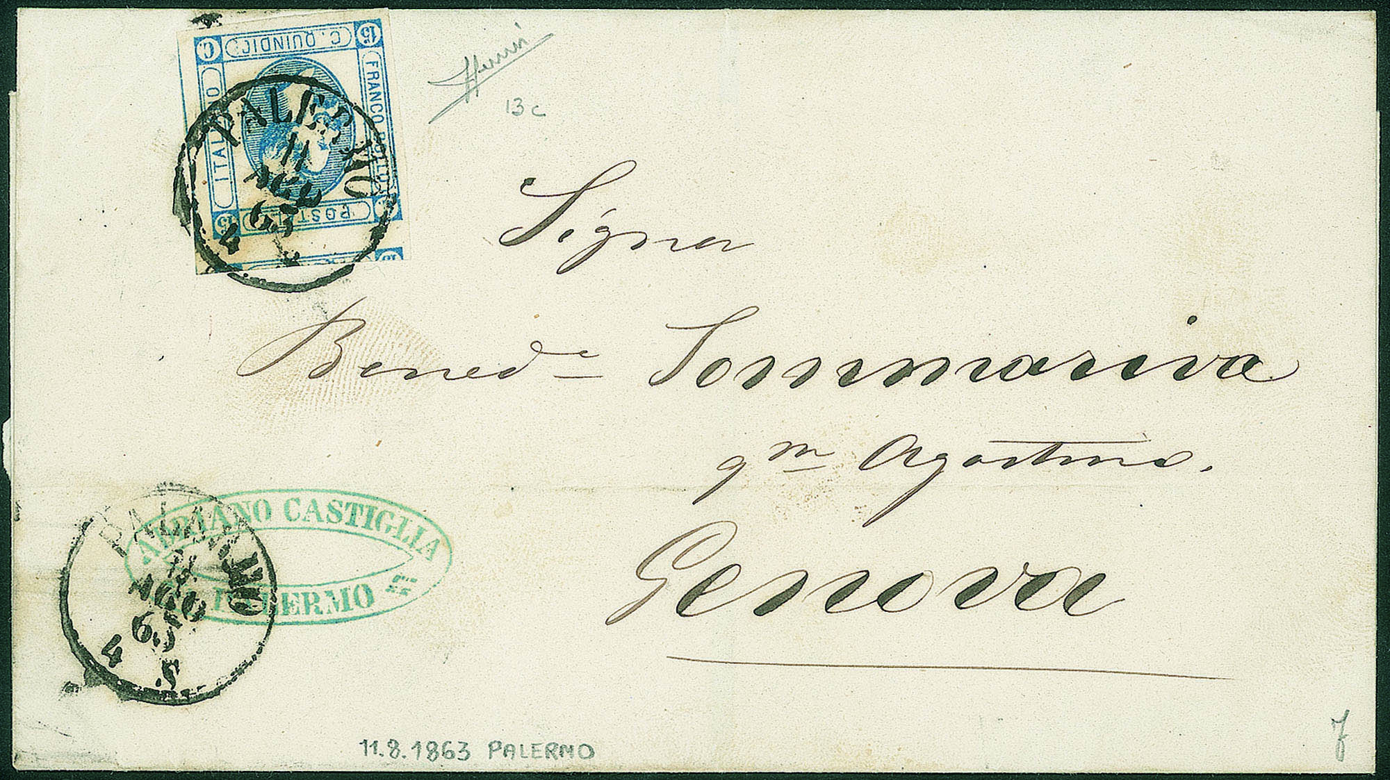 Con I di quindici formata da tre puntini - lettera da Palermo a Genova del 11.8.63 - Sorani