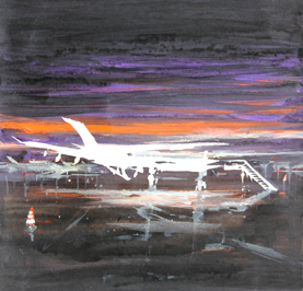 BUSCI ALESSANDRO Aereo sulla pista 2007 olio su tavola cm. 50 X 50 Firma, data 'Alessandro Busci, 2007'; timbro di Italian Factory (al retro) Autentica dell'artista su fotografia, con timbro di Italian Factory