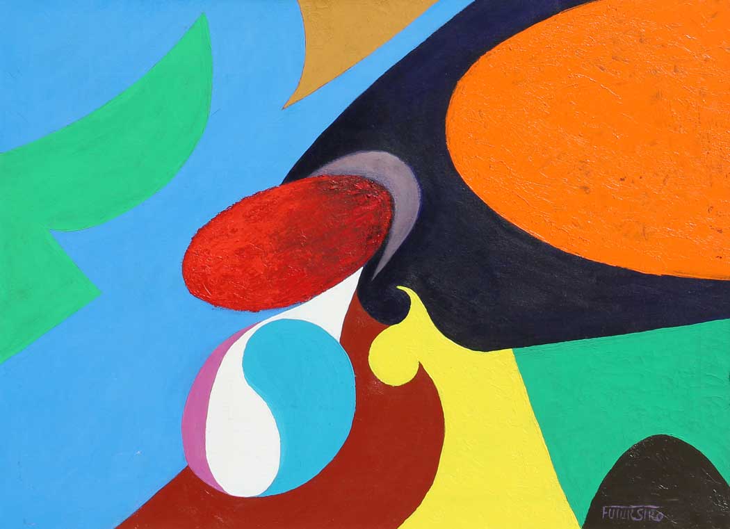 SPIRONELLO UMBERTO (FUTURSIRO) Attrazioni stellari DYO 1988 olio su tela cm. 50 X 70 Firma 'FuturSiro' (in basso a destra) Firma, data, titolo 'Futur Siro, 1988, Attrazioni stellari DYO' (al retro)