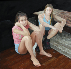 CENTONZE MIMMO Cristina e Debora 2006 olio su tela cm. 100 X 100 Titolo, data, firma 'Cristina e Debora, 2006, M. Centonze'; timbro di Italian Factory (al retro) Autentica dell'artista su fotografia