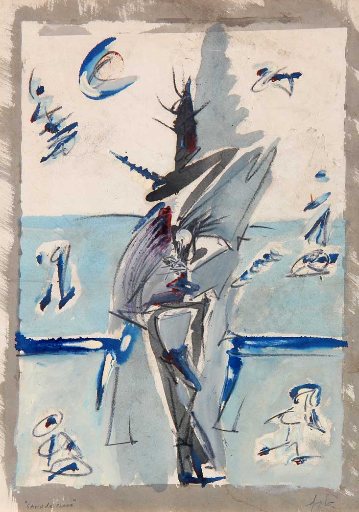DANGELO SERGIO Sapin de plage 1957 tecnica mista su carta intelata cm. 53 X 37 Titolo 'Sapin de plage' (in basso a sinistra); firma, data 'Dangelo, 57' (in basso a destra) Certificato di provenienza della Galleria Mazzoni, Piacenza