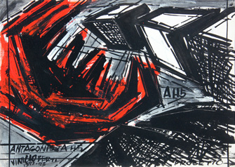 BERTI VINICIO Antagonista AH5 1972 olio su tela cm. 50 X 70 Datazione doppia: 1972/73 Titolo, firma, data 'Antagonista H5, Vinicio Berti, 1972-73' (in basso a sinistra) Firma, titolo, data 'Vinicio Berti, Antagonista AH5, 1972-73' (al retro) Autentica a cura della moglie