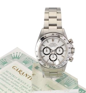 ROLEX Oyster Perpetual Cosmograph Daytona referenza 16520 del 1991 in acciaio Diam 40 mm Cassa in acciaio in 3 parti con fondo, corona e pulsanti a vite, lunetta con scala tachimetrica incisa, bracciale Oyster, quadrante con indici applicati, contatore a 30 minuti e 12 ore. Particolare referenza fuori produzione con l'apprezzato movimento automatico calibro 4030 di derivazione Zenith El Primero. Orologio corredato del suo certificato originale. A steel Oyster Perpetual Cosmograph Daytona Reference 16520, 1991