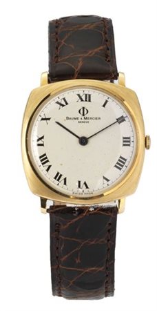 BAUME & MERCIER Solo tempo anni '60 in oro giallo Misure 30 x 30 mm Cassa a cuscino con anse dritte in due corpi, quadrante in smalto con numerazione romana, movimento a carica manuale. A yellow gold only time 60's