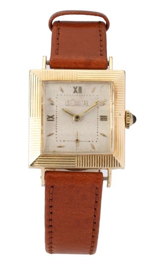 LE COULTRE Solo tempo in oro giallo anni '40 Misure 27 x 27 mm Per mercato americano, cassa quadrata oro 14 carati con lavorazione scanalata, quadrante con indici applicati alternati, numeri indici. Movimento a carica manuale. An yellow gold only time 40's