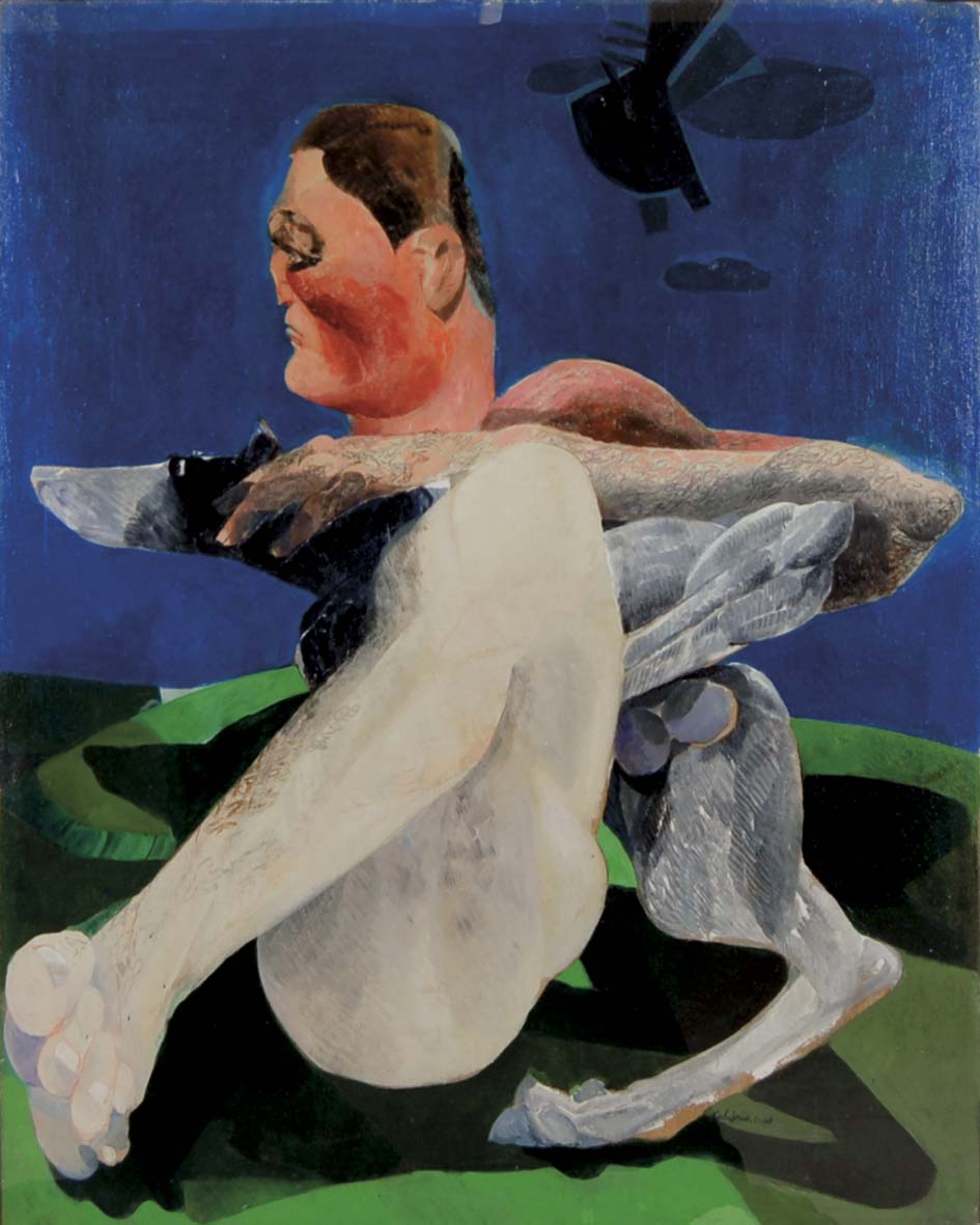 CALABRIA ENNIO Tripoli 1937 Uomo con cane 1968 olio su tela 100x80 cm firma e data in basso a destra autentica della Galleria Russo Roma su foto esposizioni Galleria Russo Roma, Galleria Nettuno - timbro al retro