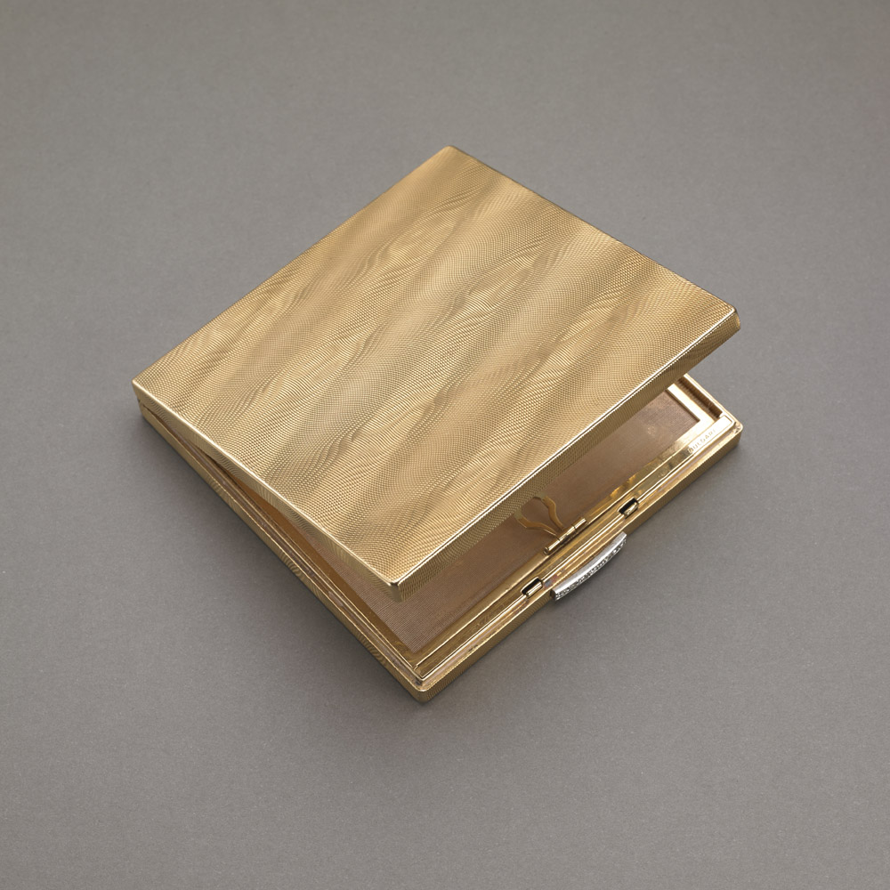 Portacipria in oro giallo con lavorazione lucido opaca in oro giallo e chiusura in oro bianco con diamanti rotondi taglio a brillante con specchio, complessivi g.195,30, Punzoni: CIF 664. BULGARI Gold compact with diamond and white gold clasp. Marks of Bulgari