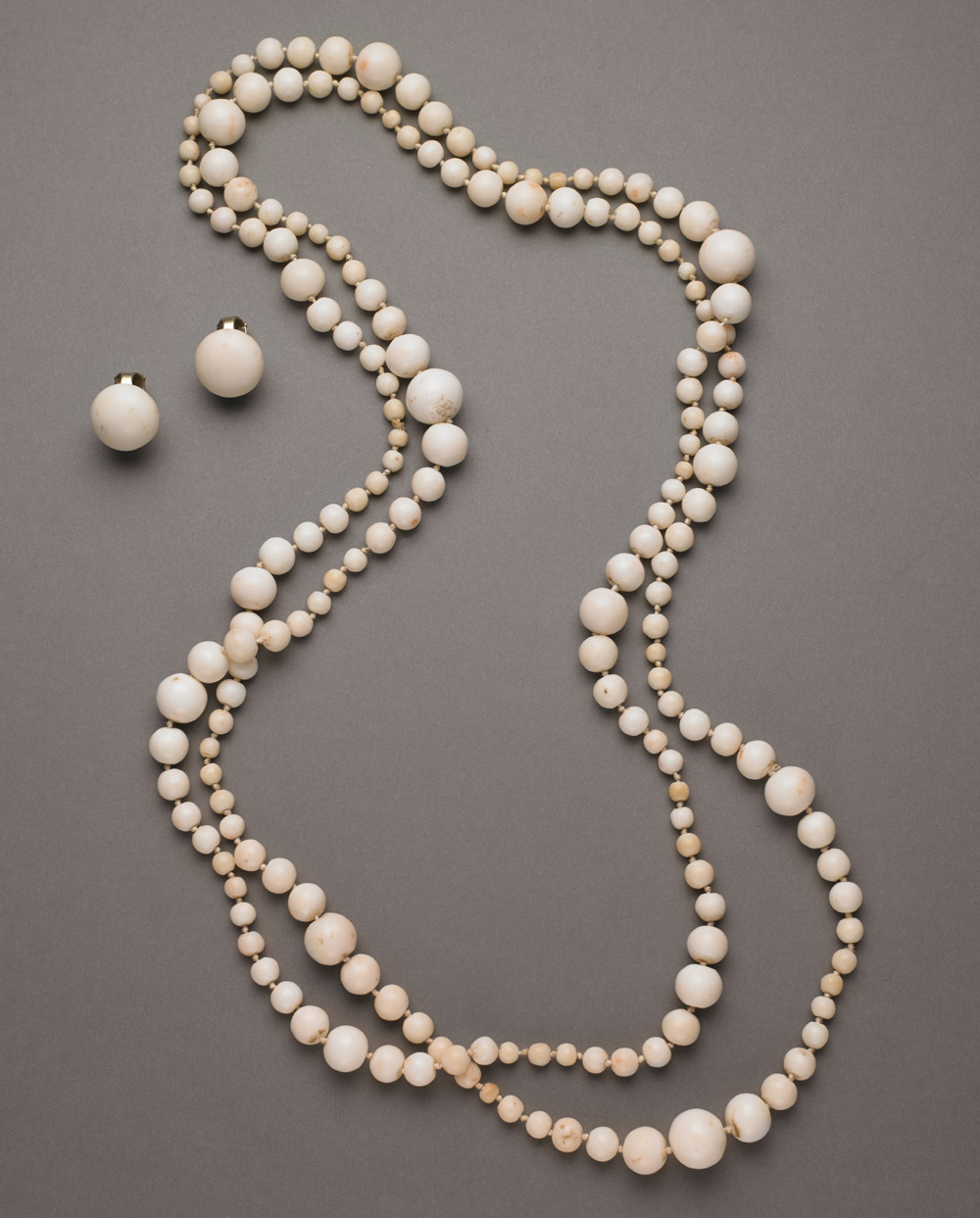 Demi-parure tutta in corallo bianco appena variegato rosa: collana lungh. 145cm circa con 15 scalature susseguenti da 4-5 a 10/13mm., orecchini a bottone 16mm. circa con clips in oro bianco, complessivi di g 122,60 White coral with rose shades and gold demi-parure comprising: a necklace and earstuds