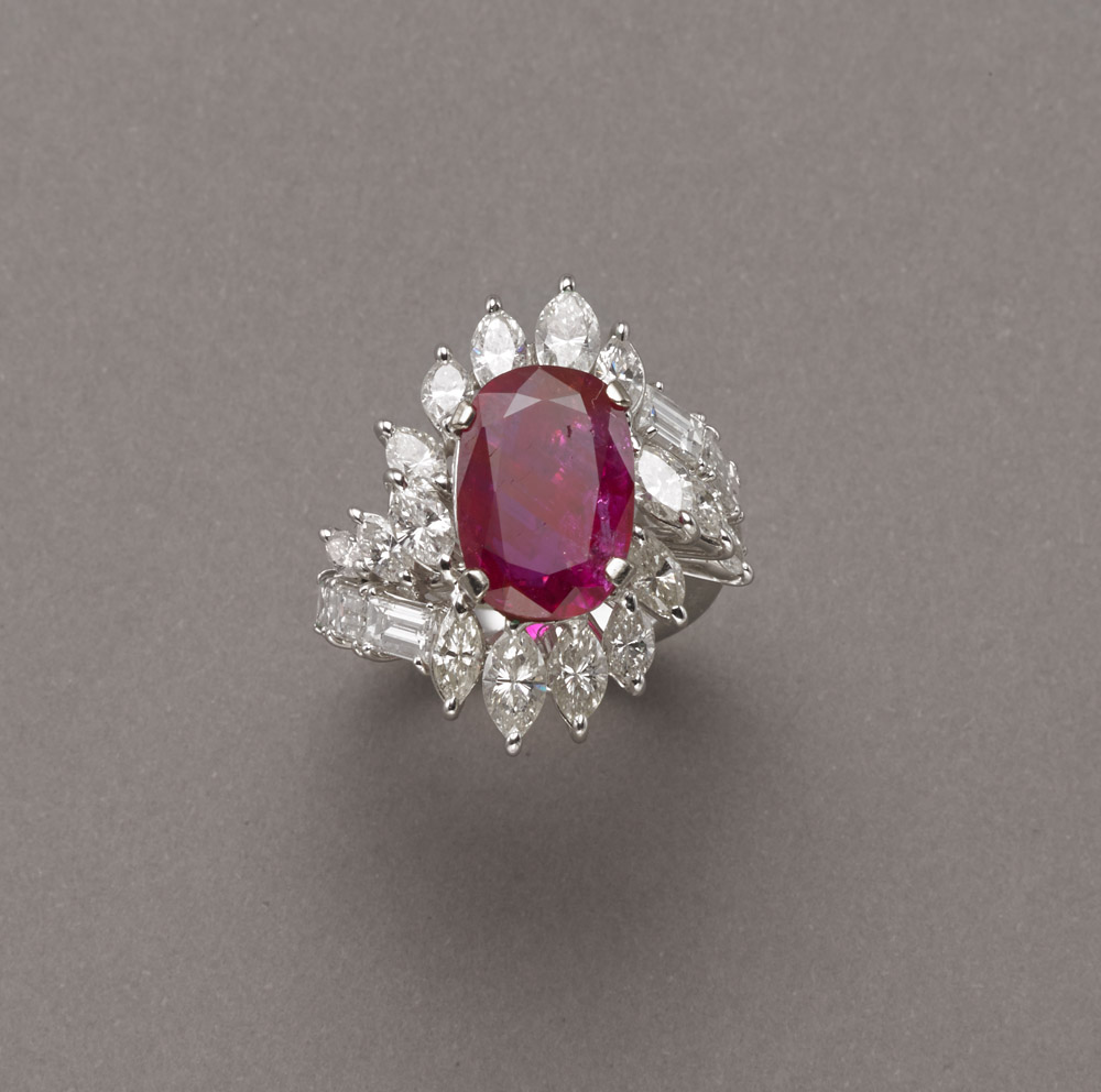 Anello in oro bianco con rubino ovale taglio composito di ct. 4,50 circa; diamanti a baguette e marquise a contornarlo e sul gambo per ct. 4,00 circa. G. 10,60, misura 12/52 Ruby and diamond white gold cluster ring