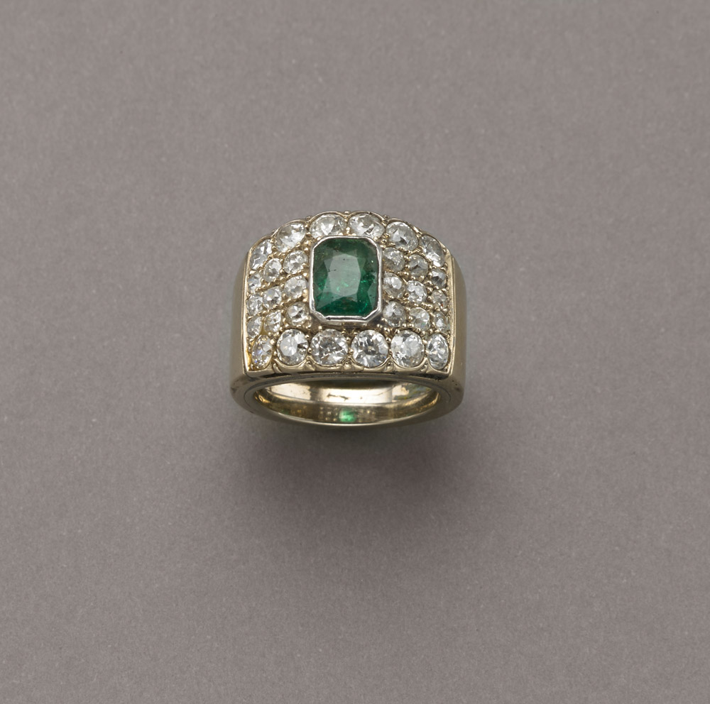Anello in oro bianco e giallo rodiato bianco con pavé di diamanti rotondi taglio vecchio europeo ed al centro smeraldo ottagonale taglio a gradini, g.10,80, misura: 13/53 Diamond -set bi-coloured gold ring centered by an emerald