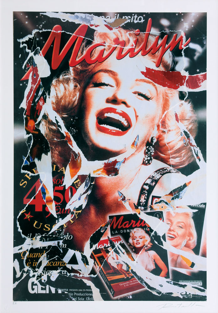 MIMMO ROTELLA Catanzaro 07/10/1918 - Milano 08/01/2006 Omaggio a Marilyn litografia a decollage su carta cm. 100x70, esemplare P.A., firma in basso a destra, pubblicata sul catalogo "Mimmo Rotella, multiples décollages", Silvana Editoriale, pagine 48-49.