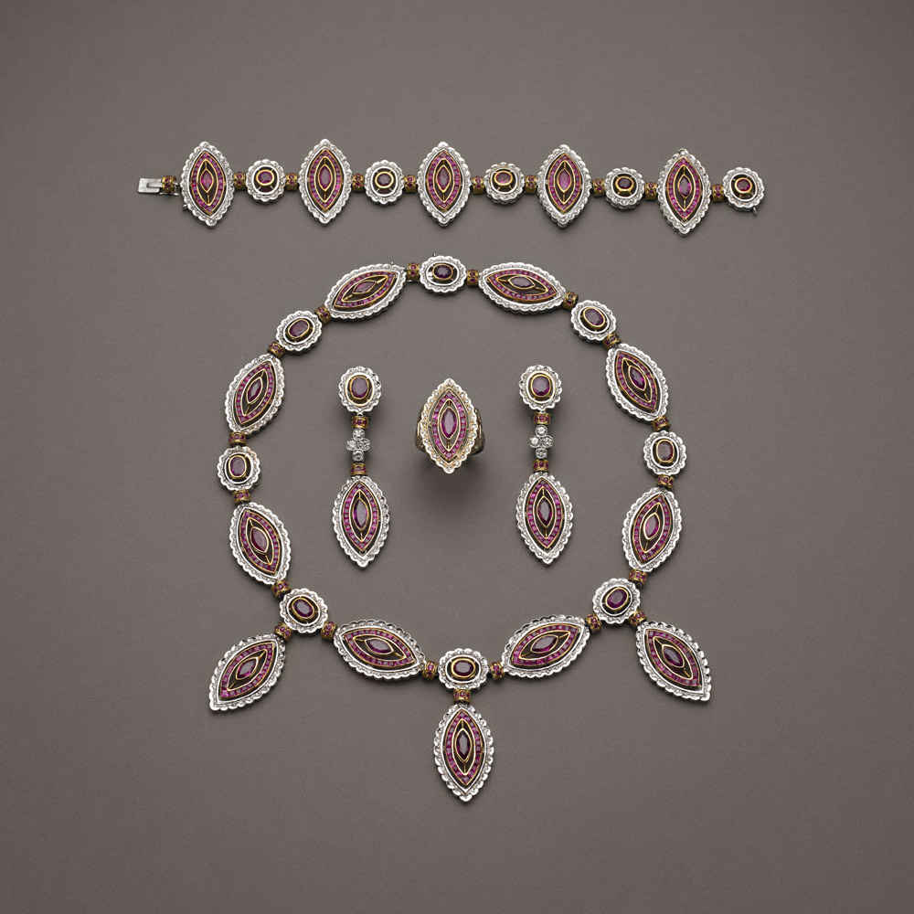 Parure d'epoca completa di collier, bracciale, orecchini ed anello in oro giallo e bianco con rubini a navette ovali e carré, diamanti rotondi, con astuccio, complessivi g.151,80 Group of vintage ruby and diamond bi-coloured gold jewellery comprising a necklace, a bracelet, a pair of ear pendants and a ring. Original box