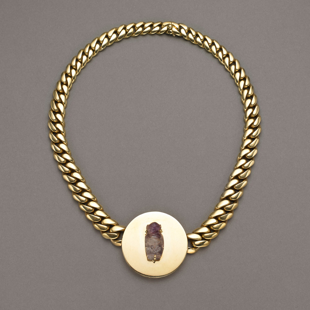 Collier anni 1970/80 in oro giallo a maglia groumette lievemnete bombata con al centro un tondo d'oro lucido che intrappola una scimmia scolpita in ametista/ialino, sul retro inciso "Primo millennio avanti Cristo", g.147,20, BVLGARI New York Flat link-chain gold necklace centered by an amethyst medallion, engraved to reverse "First millenium BC". circa 1970/80 Bulgari New York