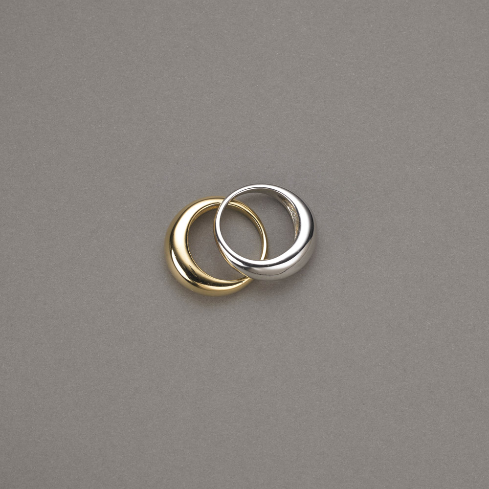 Due anelli bombati, uno in oro giallo g. 7,40, l'altro in argento g. 7,00 Two gold and silver bombé rings