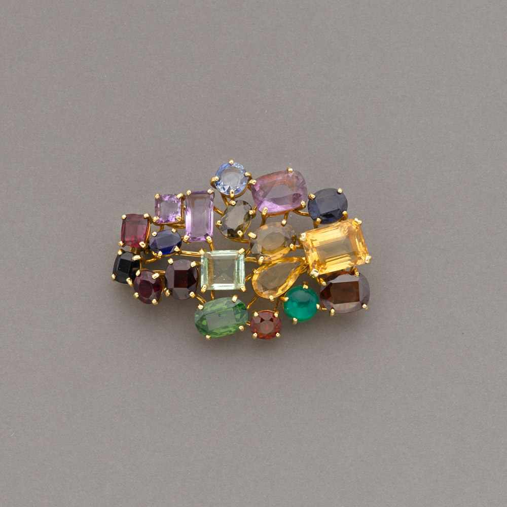 Spilla in oro giallo a fantasia di gemme di varia natura, colore, forma e...