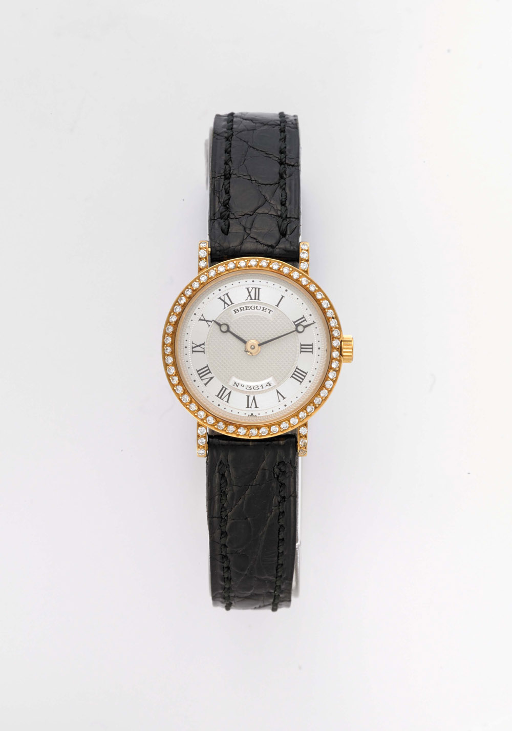 BREGUET Orologio da polso da donna in oro 18k e brillanti Anni 1980/90 ca. Quadrante, cassa e movimento firmati, movimento a carica manuale, quadrante argentato guilloché con cifre romane, fibbia originale, cassa n.520, calibro n.1273, diam. 24mm BREGUET lady's 18K gold and diamond watch, 1980/90 circa Manual-wind movement, silver-plated dial with Roman numerals, original bucket. Dial, case and movement signed (diam. 24 mm)