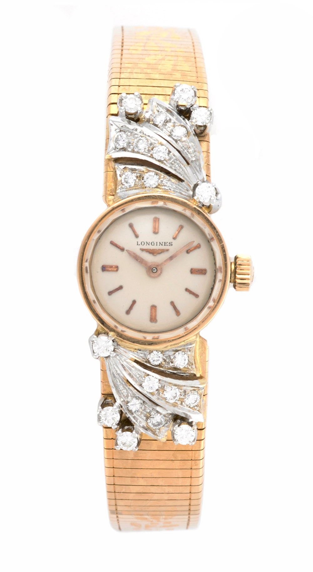 LONGINES Orologio da polso da donna in oro 18k con bracciale non originale Anni 1960 ca. Quadrante, movimento e cassa firmati, movimento a carica manuale, quadrante argentato con indici riportati in oro, cassa n.6765-9-8, diam. 15mm LONGINES lady's 18K gold wristwatch, 1960s circa Manual-wind movement, silver-plated dial applied with gold indexes. Unoriginal bracelet