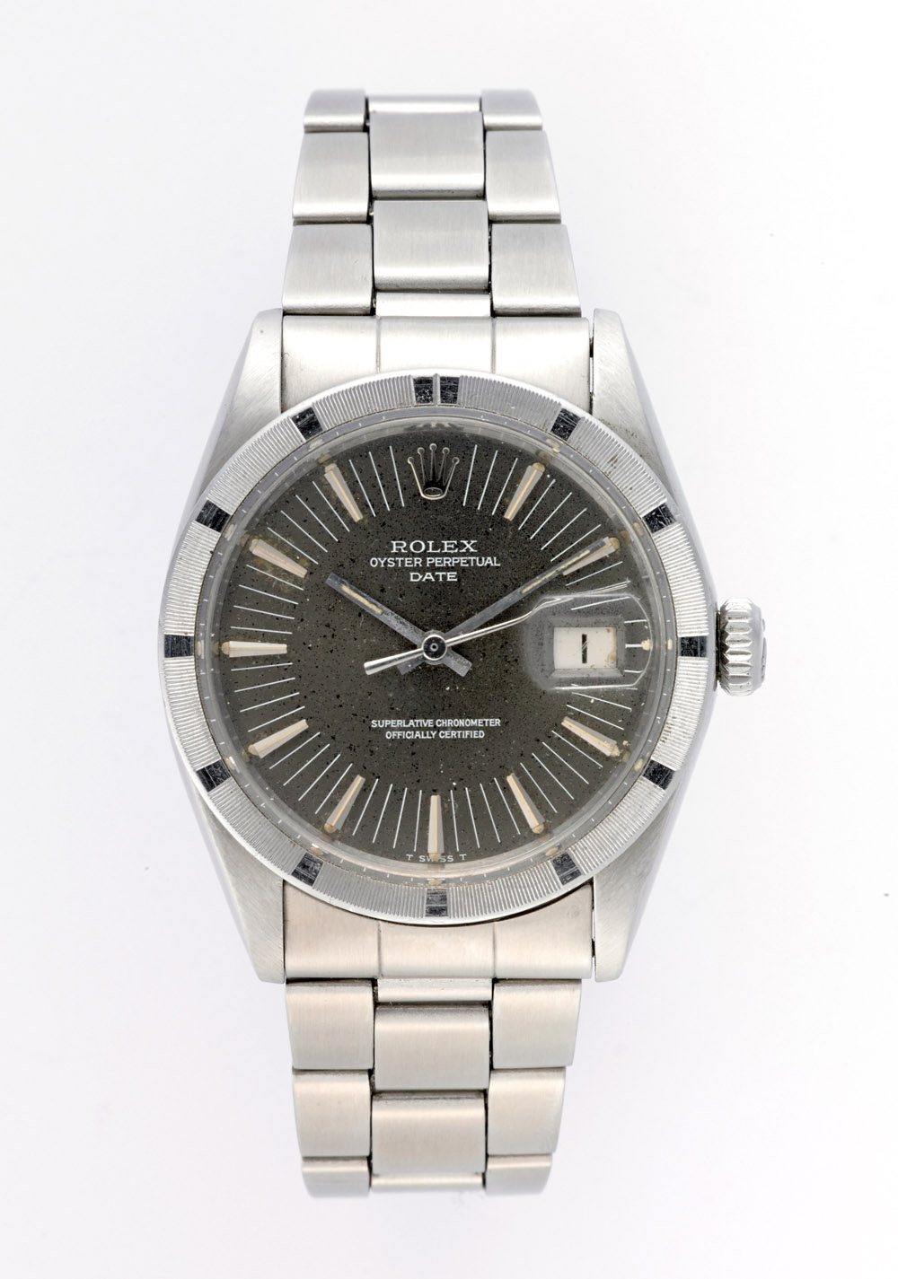 ROLEX Orologio da polso da uomo in acciaio Anni 1970 ca. Quadrante, movimento e cassa firmati, movimento a carica automatica, quadrante nero con indici riportati, cassa n.2997232, ref. n.1505, diam. 35mm ROLEX stainless steel wristwatch, 1970's circa Self-winding movement, black dial applied with indexes. Dial, movement and case signed