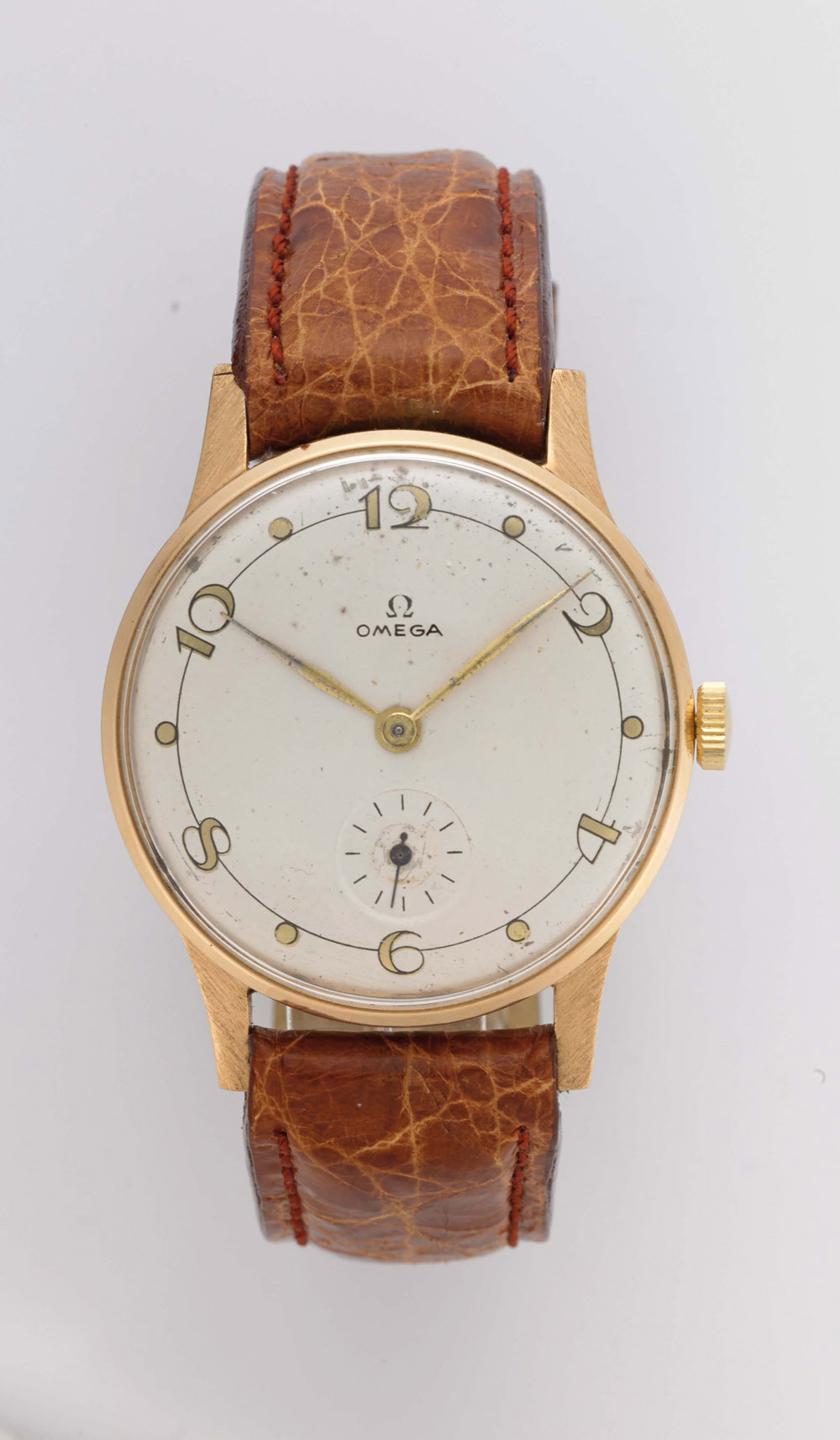 OMEGA Orologio da polso da uomo in oro 18K Anni 1940 ca. Quadrante e movimento firmati, movimento a carica manuale, quadrante argentato con indici e cifre arabe, cassa n.9010061 (non originale), diam. 37mm OMEGA 18K gold wristwatch, 1940s circa Manual-wind movement, silver-plated dial with Arabic numerals and indexes (diam. 37 mm)