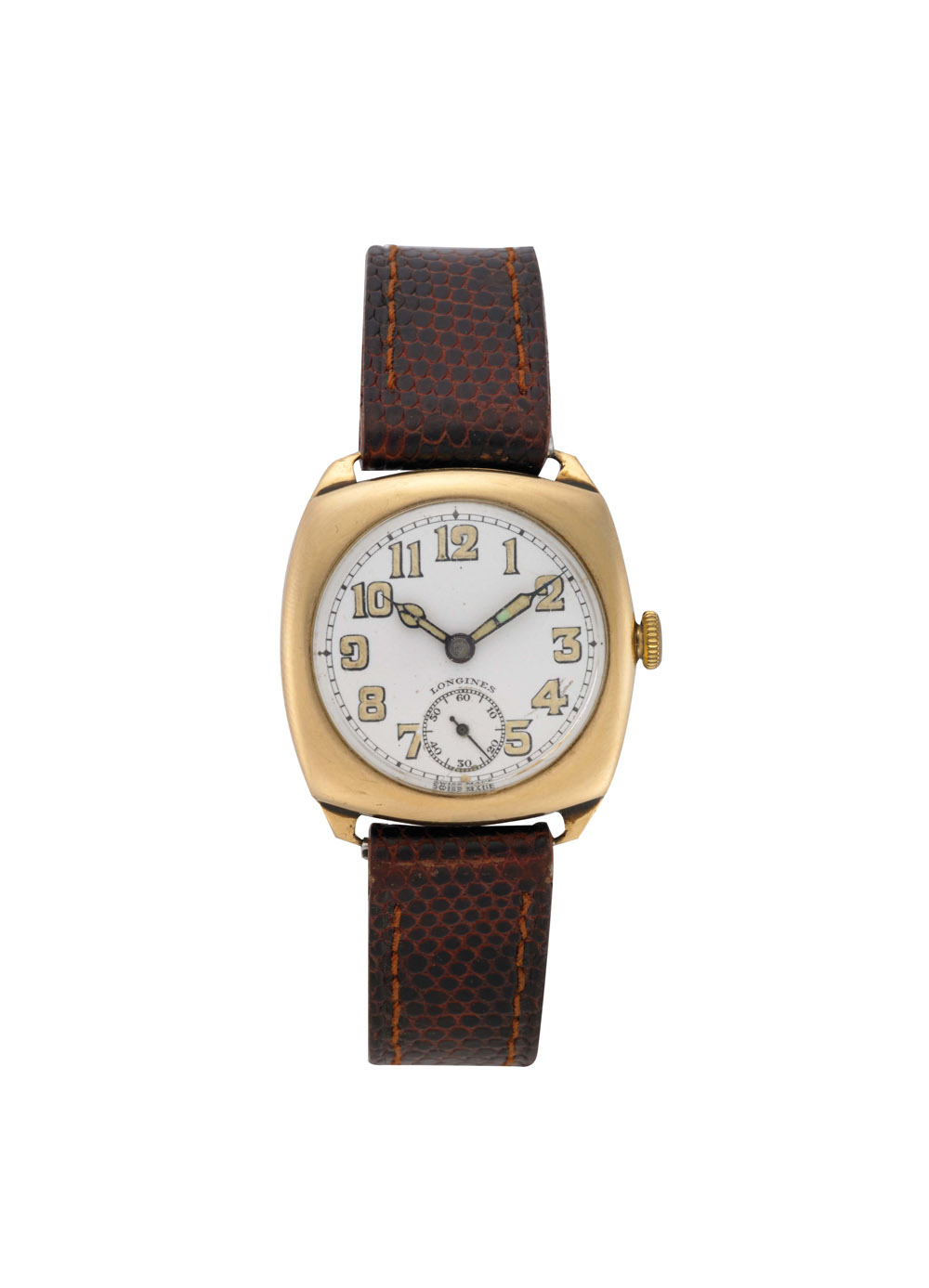 LONGINES Orologio da polso da uomo in oro 9K Fine anno 1940 ca. Quadrante e movimento firmati, movimento a carica manuale, quadrante in smalto bianco con cifre arabe radium, cassa n.19203, Punzoni Inglesi, cassa a forma di cuscino, misura: 31x31mm LONGINES 9K gold wristwatch, late 1940s circa Manual-wind movement, white enamel dial with Arabic hours, English marks (31x31 mm)
