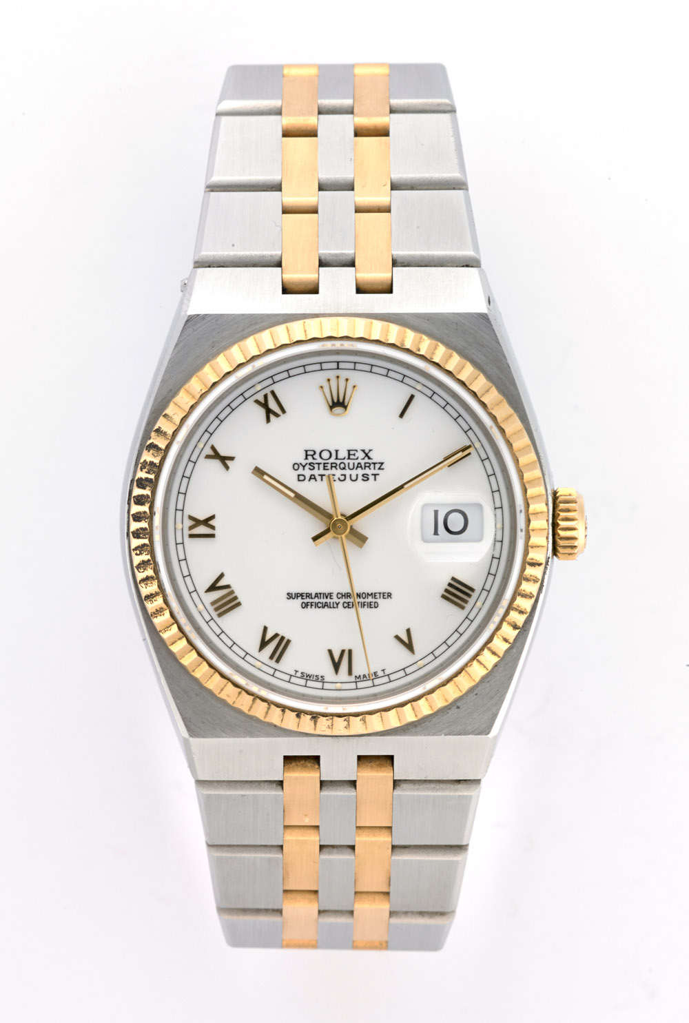 ROLEX Orologio da polso da uomo in acciaio e oro Anni 1980 ca. Quadrante, movimento e cassa firmati, movimento al quarzo, quadrante bianco con numeri romani riportati, secondi al centro, data, cassa n.358561, ref. n.17013, misura: 36x42mm ROLEX stainless steel and gold wristwatch, 1980's circa Quartz movement, white dial applied with Roman numerals, central seconds and date display. Dial, movement and case signed
