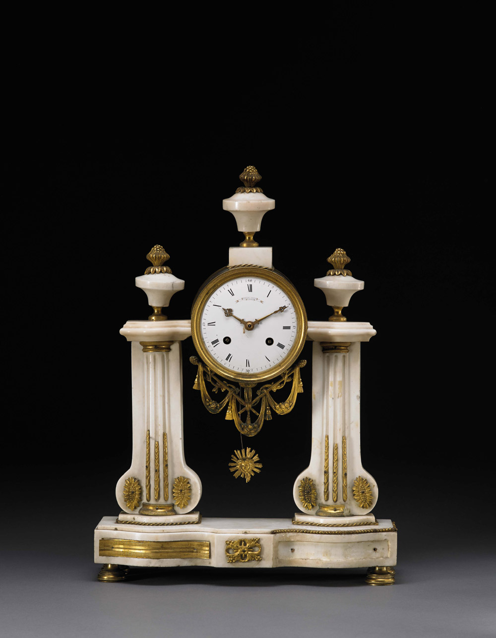 JOLLY Pendola in marmo bianco e bronzo dorato a mercurio Epoca anni fine 1700 ca. Quadrante firmato, movimento carica settimanale, scappamento ad ancora, suoneria delle ore e delle mezze su campanello, misura: alt. 48cm, largh. 35cm, prof. 12cm (difetti e mancanze) JOLLY white marble and gilt bronze pendulum clock (cm 48x35x12) (defects and losses) Late 1700s circa