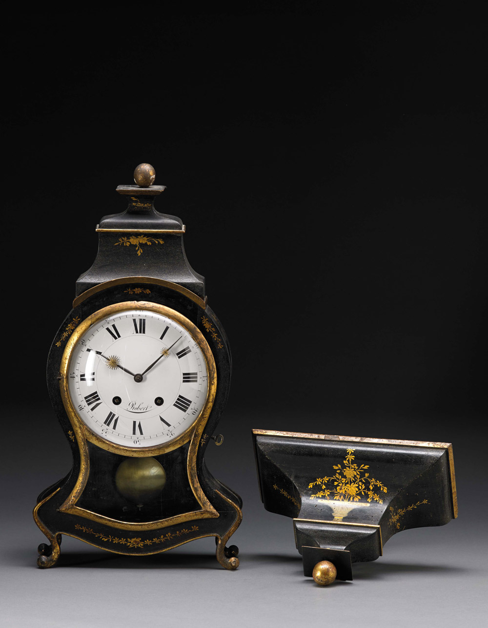 ROBERT Pendola in legno laccato di nero completa di mensola e cimasa Epoca anni 1810 ca. Quadrante firmato, movimento carica settimanale, scappamento ad ancora, suoneria delle ore e dei quarti in piccola suoneria su gong, alt. 80cm, largh. 29cm, prof. 14cm (difetti e mancanze) ROBERT black lacquered wood mantel clock (cm 80x29x14) (defects and losses) 1810s circa