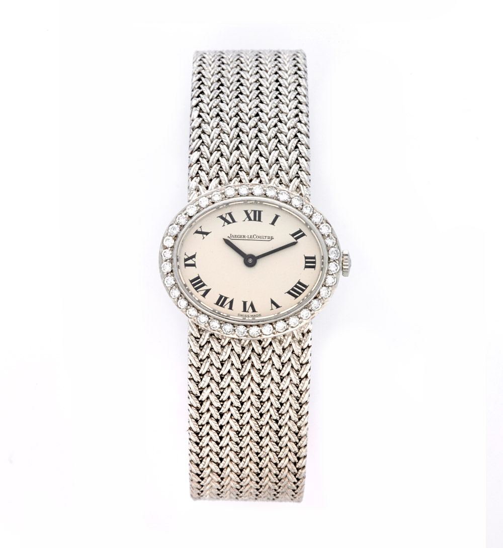 JAEGER-LECOULTRE Orologio da polso da donna in oro bianco in forma ovale con brillanti e bracciale Anni 1970 ca. Quadrante, movimento e cassa firmati, movimento a carica manuale, quadrante argentato con numeri romani, ref. n. 1130081A, misura: 23x27mm JAEGER-LECOULTRE lady's white gold bracelet watch, 1970's circa Manual-wind movement, silver-plated dial with Roman numerals. Dial, movement and case signed