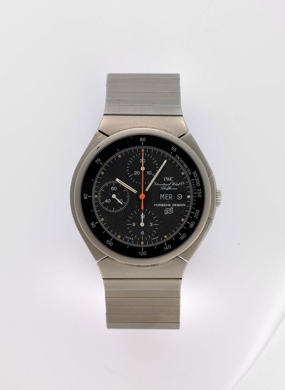 IWC PORCHE DESIGN Orologio cronografo da polso da uomo in titanio Anni 1990 ca. Quadrante, movimento e cassa firmati, movimento a carica automatica, quadrante nero, indici al trizio, ghiera tachimetrica, quadrantini ausiliari dei secondi, minuti ed ore, giorno e data, cassa n.2278891, diam. 42mm IWC PORCHE DESIGN titanium wristwatch, 1990s circa Self-wind movement, black dial with date display