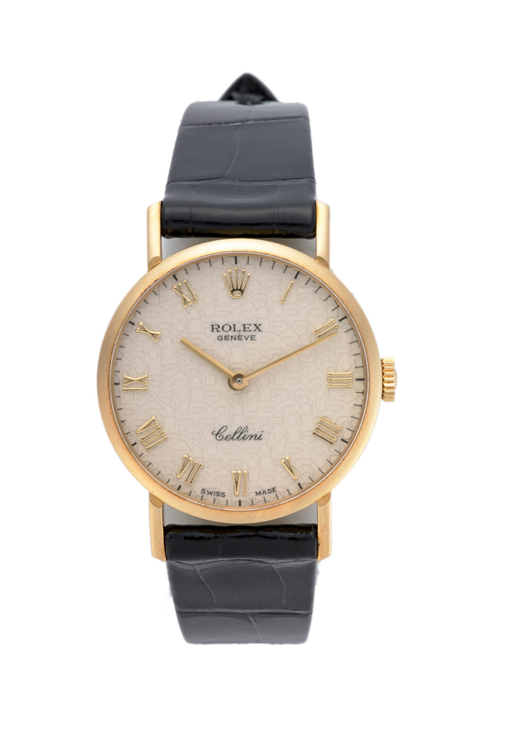 ROLEX CELLINI Orologio da polso da donna in oro 18K Anni 1990 ca. Quadrante, movimento e cassa firmati, movimento a carica manuale, quadrante argentato con numeri romani riportati in oro, cassa n.9459195-5109, diam. 26mm, con astuccio Rolex non pertinente ROLEX CELLINI lady's 18K gold wristwatch, 1990s circa Manual-wind movement, silver-plated dial applied with gold Roman numerals. Dial, movement and case signed