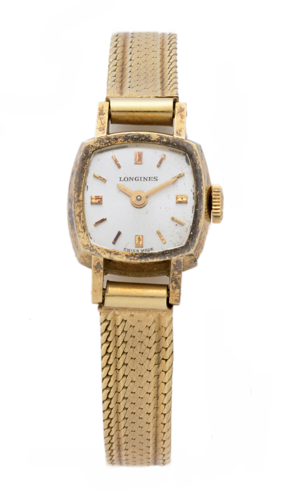 LONGINES Orologio da polso da donna in oro 18K Anni 1960 ca. Quadrante, movimento e cassa firmati, quadrante argentato, indici riportati, cassa n.7458-5, misura 15x15mm, bracciale non originale, misura: 15x15mm LONGINES lady's 18K gold wristwatch, 1960s circa Silver-plated dial applied with indexes. Dial, movement and case signed. Unoriginal bracelet