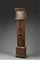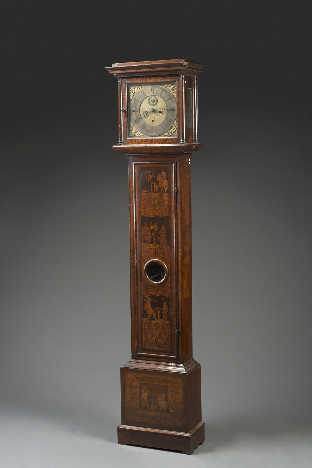 Pendola a torre, impiallicciata, filettata e intarsiata decorata da volute fogliate, scene di caccia, pastorali e guerresche Epoca prima metà del '700 Quadrante quadrato con fregi in bronzo ai quattro lati, fascia oraria con cifre romane, sotto il 12 quadrantini dei secondi e a ore 6 piccola finestrella per il calendario, movimento scappamento ad ancora a rinculo, carica settimanale, suoneria delle ore su campana (alt.217cm, largh. 47cm, prof. 26cm) (rifacimenti, difetti e mancanze) A longcase clock, decorated with scenes of hunting, pastors and warriors (remakes, loss and damage) (cm 217x47x26)