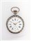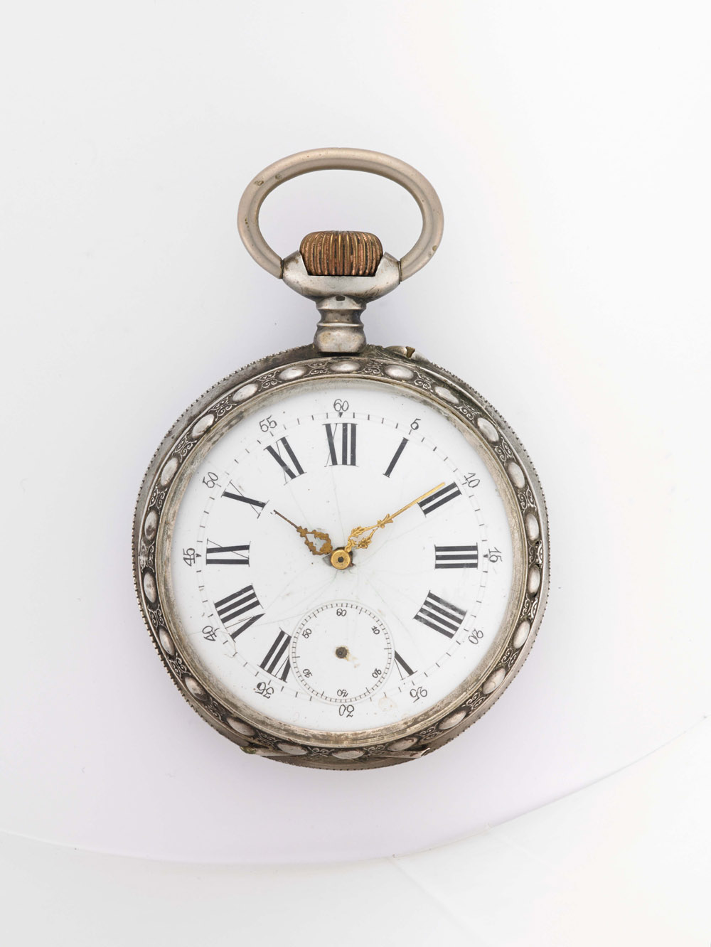 Orologio da tasca da uomo in argento Epoca inizio '900 ca. Movimento a carica manuale, quadrante in smalto bianco con cifre romane, minuti a cifre arabe (difetti e rotture), cassa n.78281, diam. 62mm A silver-plated pocket watch, early 1900s circa Manual-wind movement, white enamel dial with Roman numerals, the minutes of Arabic numerals (defects) (diam. 62mm)