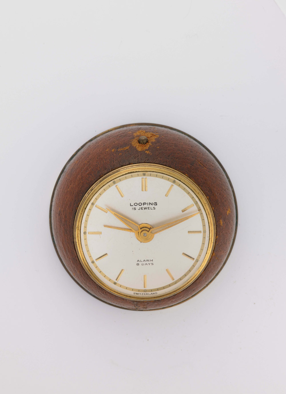 LOOPING Sveglietta da viaggio Anni 1950 ca. Quadrante, movimento e cassa firmati, quadrante argentato con indici riportati, movimento carica 8 giorni, cassa in ottone rivestita di pelle (press papier), funzionante, diam. 62mm, con astuccio (difetti) LOOPIN travel alarm clock, 1950s circa 8-day manual-wind movement, silver-plated dial. (diam. 62 mm)