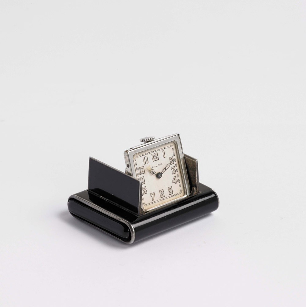 LECAPTIF orologio da borsetta Anni 1930/40 ca. In argento 925/1000 con smalto nero, apertura con pressione alle estremità, n.serie 9554. Firmato: BREVETE' DEPOSITE' dalla TAVANNES WATCH CO, movimento e cassa firmati TAVANNES, quadrante probabile ristampa, misura: 47x33mm, funzionante LECAPTIF 925 silver and black enamel purse watch, signed BREVETE' DEPOSITE', the dial probaby reprinted (mm 47x33) 1930/40s circa