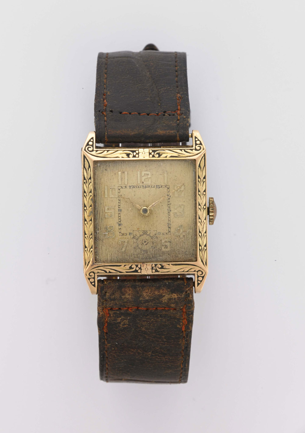 HEILA Orologio da polso da uomo in oro 14K Anni 1940 ca. Movimento firmato, carica manuale, quadrante champagne con cifre arabe, cassa n.63017, misura: 25x33mm HEILA 14K gold wristwatch, 1940s circa Manual-wind movement, champagne dial with Arabic numerals (25x33 mm)