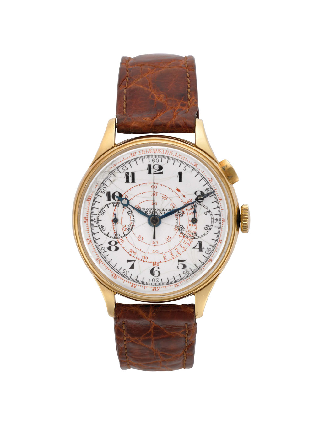 LEMANIA orologio da polso da uomo in oro 18K Anni 1940 ca. Quadrante e movimento firmati, movimento a carica manuale, quadrante in smalto bianco con quadrantini ausiliari con secondi continui e minuti, misura: 38mm (difetti e rotture), cassa non originale LEMANIA 18K gold wristwatch, 1940's circa Manual-wind movement, white enamel dial with auxiliary rings for the seconds and minutes registers (defects). Dial and movement signed