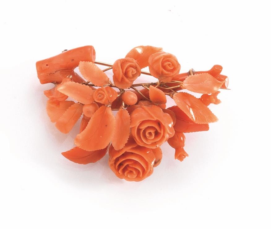SPILLA E BRACCIALE IN ORO A BASSO TITOLO, ARGENTO E CORALLOla spilla...