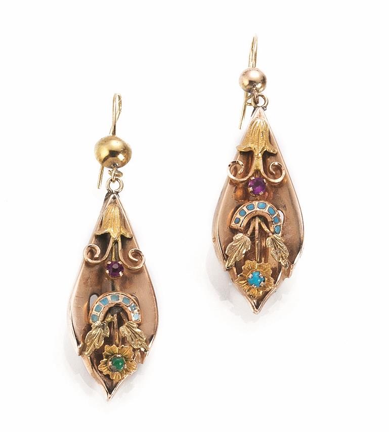 rispettivamente realizzati con una monachella a cui è sospesa tramite una sferetta sbalzata un anello bombato cesellato a testa d'ariete con pendente al centro; a goccia in lamina sbalzata decorata da smalti turchesi e pietre, g 17 complessivi