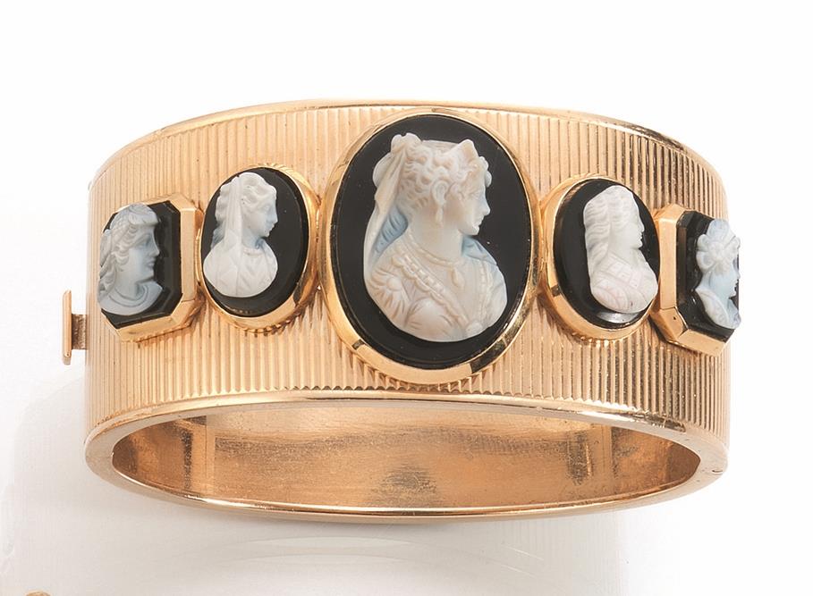 BRACCIALE IN ORO GIALLO 14 K E CAMMEI IN ONICEa cerchio rigido con...