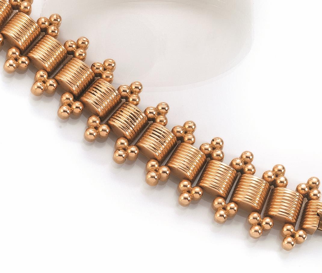 realizzato ad una linea centrale di barilotti rigati profilata su entrambi i lati da elementi a trifoglio formati da piccole sfere in oro liscio, punzone 750, g 68
