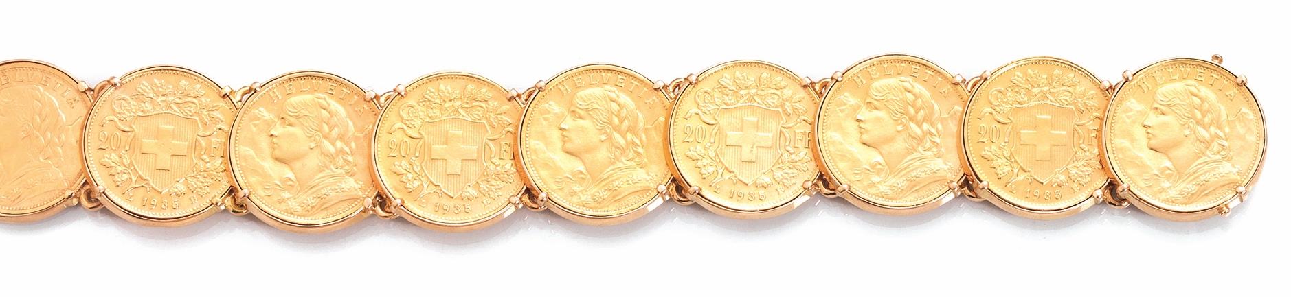 BRACCIALE IN ORO GIALLO E MONETErealizzato ad una fila di nove franchi...
