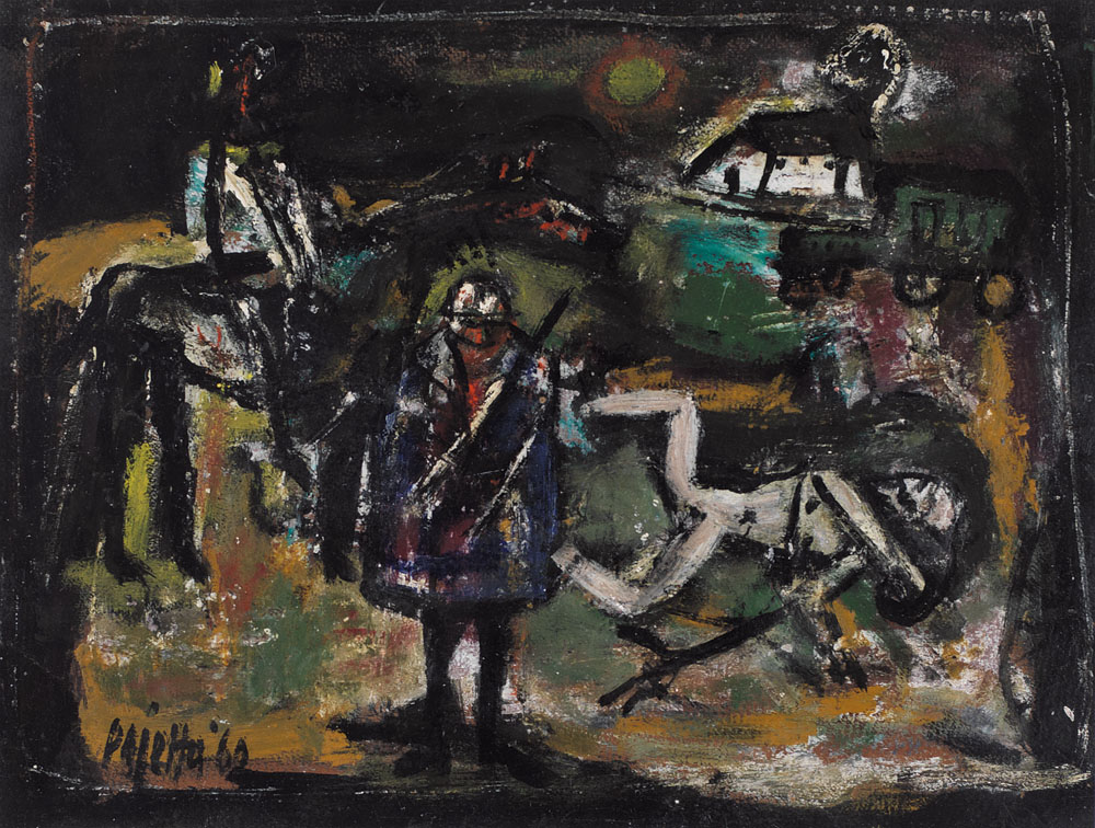 GUIDO PAJETTA Monza (Mi) 08/02/1898 - Milano 15/02/1987 Scena di guerra, 1960 olio su cartone cm.38x51, firma e anno in basso a sinistra, pubblicato su "Guido Pajetta, catalogo generale ragionato dei dipinti", volume primo, 1914-1963, a cura di Enrico Crispolti, Edizioni Mazzotta, al numero 1960/69, pagina 599, con dimensioni errate.
