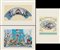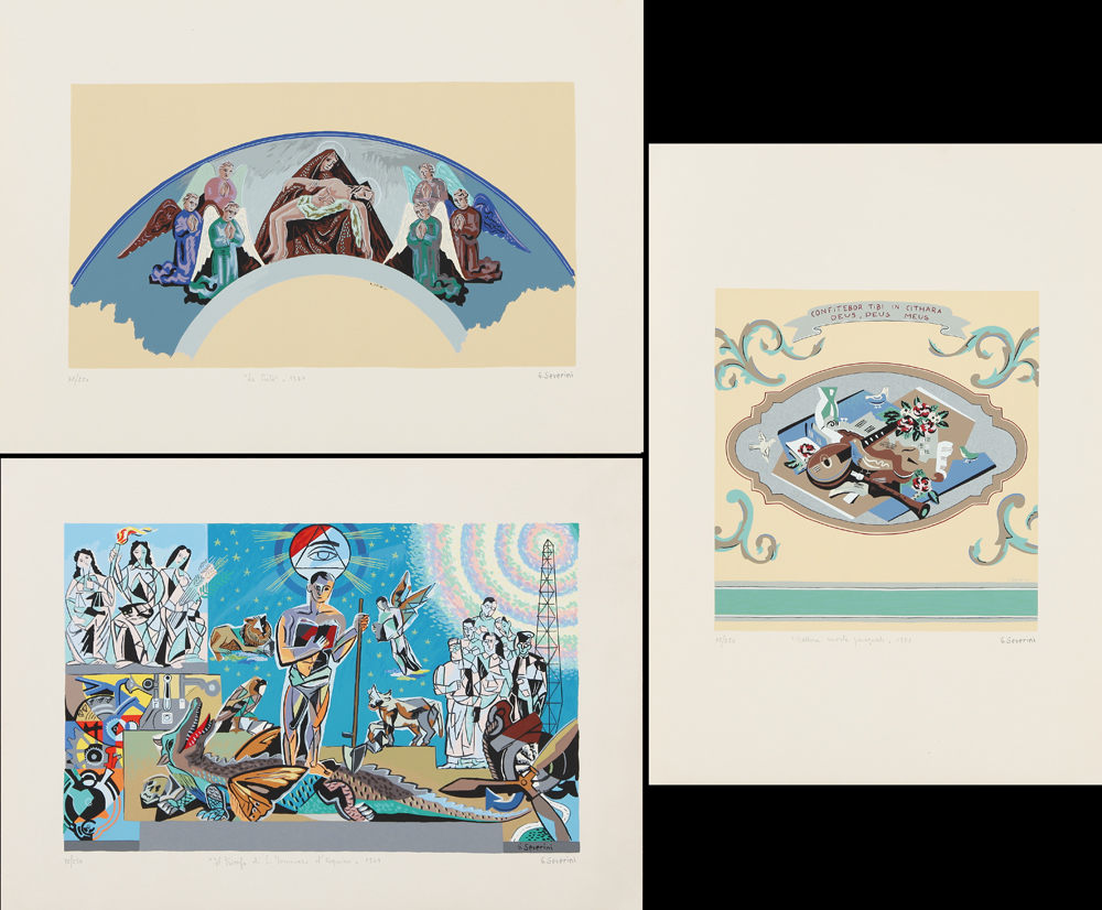 GINO SEVERINI Cortona (Ar) 07/04/1883 - Parigi (Francia) 26/02/1966 Una ricerca di radici cartella di 3 serigrafie su carta Rosaspina della Fabriano cm. 50x70, esemplare 72/250, A2 Edizioni d'Arte (Roma), testo critico di Maurizio Fagiolo dell'Arco. I soggetti sono: - Natura morta pasquale, 1928, studio per l'affresco realizzato nella tribuna d'organo della chiesa di La Roche, Canton di Friburgo, Svizzera; - Il trionfo di S. Tommaso d'Aquino, 1949, studio per il grande mosaico realizzato per l'Università Cattolica di Friburgo; - La pietà, 1927, studio per l'affresco realizzato nella chiesa di La Roche, Canton di Friburgo, Svizzera. Le opere sono state realizzate presso la Stamperia d'Arte Grafiser in Roma nel giugno 1983 e portano "in folio" la firma serigrafata dall'artista. Ogni esemplare è numerato, intitolato e timbrato dell'Editore e porta sul retro la firma autografa, a matita e per esteso di Gina Severini Franchina, figlia dell'artista.