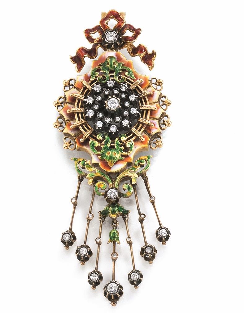 PENDENTE-SPILLA, SEC. XIX, IN ORO GIALLO, ARGENTO, DIAMANTI E SMALTI