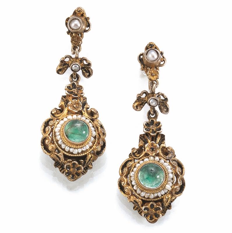 PAIO DI ORECCHINI PENDENTI, SEC. XIX, IN ORO A BASSO TITOLO, SMERALDI, MICROPERLE E SMALTI