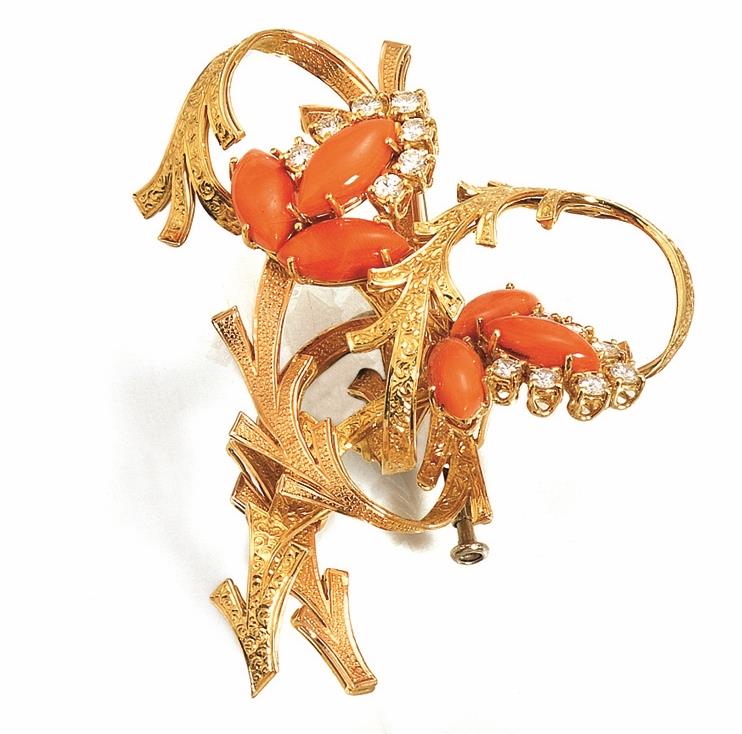 SPILLA IN ORO GIALLO, CORALLO E DIAMANTIrealizzata a volute in oro giallo...