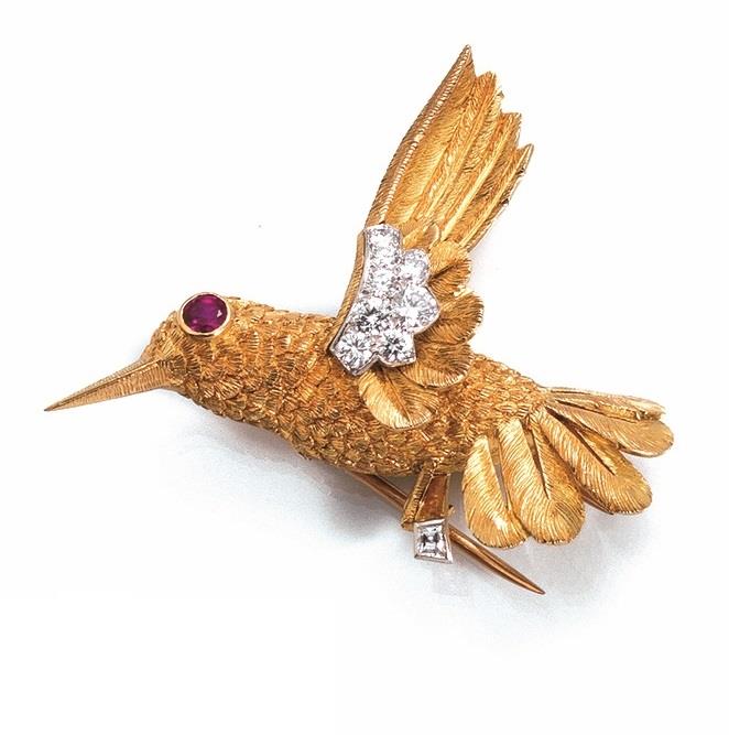 Lotto 309 | SPILLA, CARTIER, IN ORO GIALLO, RUBINO E DIAMANTImodellata come un colibri in...