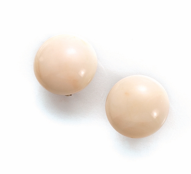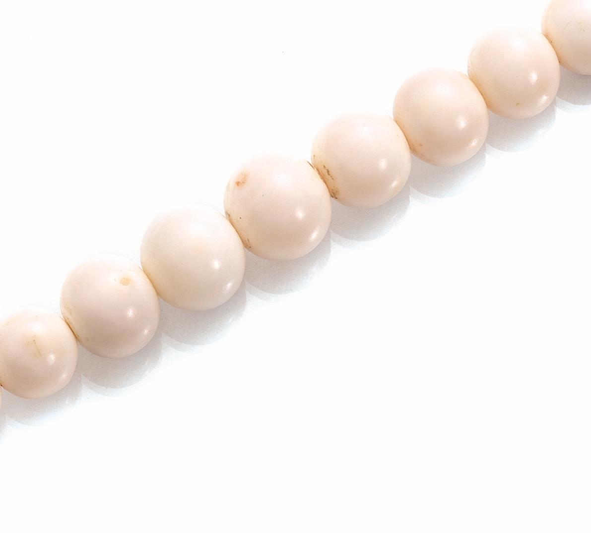 la collana realizzata ad una fila di sfere poste in gradazione da mm 9 a mm 17.5 in corallo bianco, fermatura in oro giallo a grappolo; ciascun orecchino di forma a bottone in corallo bianco, punzone 750, g 150 complessivi